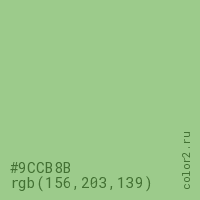 Цвет #9CCB8B в цветовой модели RGB обозначается тремя октетами (156, 203, 139) в десятичном формате и #9CCB8B в шестнадцатиричном (hex) формате, которые являются интенсивностью красного 156 (hex 9C), интенсивность зелёного 203 (hex CB) и интенсивность синего 139 (hex 8B).