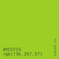 Цвет #9CCF25 в цветовой модели RGB обозначается тремя октетами (156, 207, 37) в десятичном формате и #9CCF25 в шестнадцатиричном (hex) формате, которые являются интенсивностью красного 156 (hex 9C), интенсивность зелёного 207 (hex CF) и интенсивность синего 37 (hex 25).