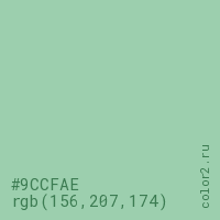 Цвет #9CCFAE в цветовой модели RGB обозначается тремя октетами (156, 207, 174) в десятичном формате и #9CCFAE в шестнадцатиричном (hex) формате, которые являются интенсивностью красного 156 (hex 9C), интенсивность зелёного 207 (hex CF) и интенсивность синего 174 (hex AE).