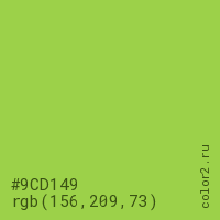 Цвет #9CD149 в цветовой модели RGB обозначается тремя октетами (156, 209, 73) в десятичном формате и #9CD149 в шестнадцатиричном (hex) формате, которые являются интенсивностью красного 156 (hex 9C), интенсивность зелёного 209 (hex D1) и интенсивность синего 73 (hex 49).