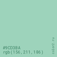 Цвет #9CD3BA в цветовой модели RGB обозначается тремя октетами (156, 211, 186) в десятичном формате и #9CD3BA в шестнадцатиричном (hex) формате, которые являются интенсивностью красного 156 (hex 9C), интенсивность зелёного 211 (hex D3) и интенсивность синего 186 (hex BA).