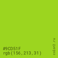 Цвет #9CD51F в цветовой модели RGB обозначается тремя октетами (156, 213, 31) в десятичном формате и #9CD51F в шестнадцатиричном (hex) формате, которые являются интенсивностью красного 156 (hex 9C), интенсивность зелёного 213 (hex D5) и интенсивность синего 31 (hex 1F).