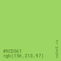 Цвет #9CD561 в цветовой модели RGB обозначается тремя октетами (156, 213, 97) в десятичном формате и #9CD561 в шестнадцатиричном (hex) формате, которые являются интенсивностью красного 156 (hex 9C), интенсивность зелёного 213 (hex D5) и интенсивность синего 97 (hex 61).