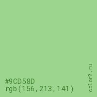Цвет #9CD58D в цветовой модели RGB обозначается тремя октетами (156, 213, 141) в десятичном формате и #9CD58D в шестнадцатиричном (hex) формате, которые являются интенсивностью красного 156 (hex 9C), интенсивность зелёного 213 (hex D5) и интенсивность синего 141 (hex 8D).