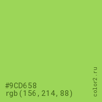 Цвет #9CD658 в цветовой модели RGB обозначается тремя октетами (156, 214, 88) в десятичном формате и #9CD658 в шестнадцатиричном (hex) формате, которые являются интенсивностью красного 156 (hex 9C), интенсивность зелёного 214 (hex D6) и интенсивность синего 88 (hex 58).