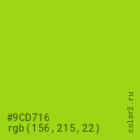 Цвет #9CD716 в цветовой модели RGB обозначается тремя октетами (156, 215, 22) в десятичном формате и #9CD716 в шестнадцатиричном (hex) формате, которые являются интенсивностью красного 156 (hex 9C), интенсивность зелёного 215 (hex D7) и интенсивность синего 22 (hex 16).