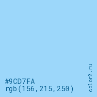 Цвет #9CD7FA в цветовой модели RGB обозначается тремя октетами (156, 215, 250) в десятичном формате и #9CD7FA в шестнадцатиричном (hex) формате, которые являются интенсивностью красного 156 (hex 9C), интенсивность зелёного 215 (hex D7) и интенсивность синего 250 (hex FA).