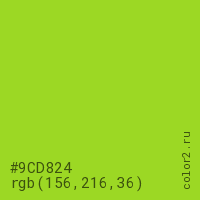 Цвет #9CD824 в цветовой модели RGB обозначается тремя октетами (156, 216, 36) в десятичном формате и #9CD824 в шестнадцатиричном (hex) формате, которые являются интенсивностью красного 156 (hex 9C), интенсивность зелёного 216 (hex D8) и интенсивность синего 36 (hex 24).