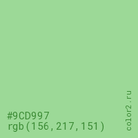 Цвет #9CD997 в цветовой модели RGB обозначается тремя октетами (156, 217, 151) в десятичном формате и #9CD997 в шестнадцатиричном (hex) формате, которые являются интенсивностью красного 156 (hex 9C), интенсивность зелёного 217 (hex D9) и интенсивность синего 151 (hex 97).