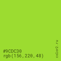Цвет #9CDC30 в цветовой модели RGB обозначается тремя октетами (156, 220, 48) в десятичном формате и #9CDC30 в шестнадцатиричном (hex) формате, которые являются интенсивностью красного 156 (hex 9C), интенсивность зелёного 220 (hex DC) и интенсивность синего 48 (hex 30).