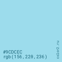 Цвет RGB(156, 220, 236) в процентом отношении количества цвета состоит из 61.2% красного (red), 86.3% зелёного (green) и 92.5% синего (blue).