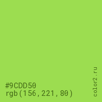 Цвет #9CDD50 в цветовой модели RGB обозначается тремя октетами (156, 221, 80) в десятичном формате и #9CDD50 в шестнадцатиричном (hex) формате, которые являются интенсивностью красного 156 (hex 9C), интенсивность зелёного 221 (hex DD) и интенсивность синего 80 (hex 50).