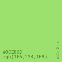 Цвет #9CE06D в цветовой модели RGB обозначается тремя октетами (156, 224, 109) в десятичном формате и #9CE06D в шестнадцатиричном (hex) формате, которые являются интенсивностью красного 156 (hex 9C), интенсивность зелёного 224 (hex E0) и интенсивность синего 109 (hex 6D).