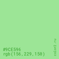 Цвет #9CE596 в цветовой модели RGB обозначается тремя октетами (156, 229, 150) в десятичном формате и #9CE596 в шестнадцатиричном (hex) формате, которые являются интенсивностью красного 156 (hex 9C), интенсивность зелёного 229 (hex E5) и интенсивность синего 150 (hex 96).
