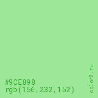 Цвет #9CE898 в цветовой модели RGB обозначается тремя октетами (156, 232, 152) в десятичном формате и #9CE898 в шестнадцатиричном (hex) формате, которые являются интенсивностью красного 156 (hex 9C), интенсивность зелёного 232 (hex E8) и интенсивность синего 152 (hex 98).