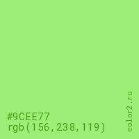 Цвет #9CEE77 в цветовой модели RGB обозначается тремя октетами (156, 238, 119) в десятичном формате и #9CEE77 в шестнадцатиричном (hex) формате, которые являются интенсивностью красного 156 (hex 9C), интенсивность зелёного 238 (hex EE) и интенсивность синего 119 (hex 77).