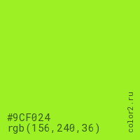 Цвет #9CF024 в цветовой модели RGB обозначается тремя октетами (156, 240, 36) в десятичном формате и #9CF024 в шестнадцатиричном (hex) формате, которые являются интенсивностью красного 156 (hex 9C), интенсивность зелёного 240 (hex F0) и интенсивность синего 36 (hex 24).