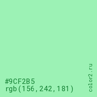 Цвет #9CF2B5 в цветовой модели RGB обозначается тремя октетами (156, 242, 181) в десятичном формате и #9CF2B5 в шестнадцатиричном (hex) формате, которые являются интенсивностью красного 156 (hex 9C), интенсивность зелёного 242 (hex F2) и интенсивность синего 181 (hex B5).