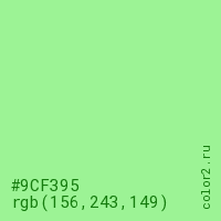 Цвет #9CF395 в цветовой модели RGB обозначается тремя октетами (156, 243, 149) в десятичном формате и #9CF395 в шестнадцатиричном (hex) формате, которые являются интенсивностью красного 156 (hex 9C), интенсивность зелёного 243 (hex F3) и интенсивность синего 149 (hex 95).