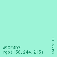 Цвет #9CF4D7 в цветовой модели RGB обозначается тремя октетами (156, 244, 215) в десятичном формате и #9CF4D7 в шестнадцатиричном (hex) формате, которые являются интенсивностью красного 156 (hex 9C), интенсивность зелёного 244 (hex F4) и интенсивность синего 215 (hex D7).