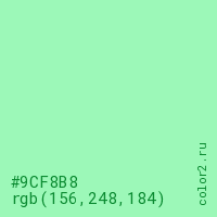 Цвет #9CF8B8 в цветовой модели RGB обозначается тремя октетами (156, 248, 184) в десятичном формате и #9CF8B8 в шестнадцатиричном (hex) формате, которые являются интенсивностью красного 156 (hex 9C), интенсивность зелёного 248 (hex F8) и интенсивность синего 184 (hex B8).