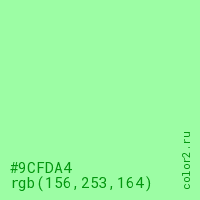 Цвет #9CFDA4 в цветовой модели RGB обозначается тремя октетами (156, 253, 164) в десятичном формате и #9CFDA4 в шестнадцатиричном (hex) формате, которые являются интенсивностью красного 156 (hex 9C), интенсивность зелёного 253 (hex FD) и интенсивность синего 164 (hex A4).