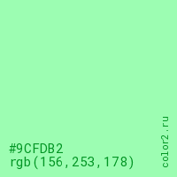 Цвет #9CFDB2 в цветовой модели RGB обозначается тремя октетами (156, 253, 178) в десятичном формате и #9CFDB2 в шестнадцатиричном (hex) формате, которые являются интенсивностью красного 156 (hex 9C), интенсивность зелёного 253 (hex FD) и интенсивность синего 178 (hex B2).