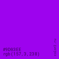 Цвет #9D03EE в цветовой модели RGB обозначается тремя октетами (157, 3, 238) в десятичном формате и #9D03EE в шестнадцатиричном (hex) формате, которые являются интенсивностью красного 157 (hex 9D), интенсивность зелёного 3 (hex 03) и интенсивность синего 238 (hex EE).
