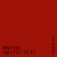 Цвет #9D1106 в цветовой модели RGB обозначается тремя октетами (157, 17, 6) в десятичном формате и #9D1106 в шестнадцатиричном (hex) формате, которые являются интенсивностью красного 157 (hex 9D), интенсивность зелёного 17 (hex 11) и интенсивность синего 6 (hex 06).