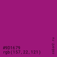 Цвет #9D1679 в цветовой модели RGB обозначается тремя октетами (157, 22, 121) в десятичном формате и #9D1679 в шестнадцатиричном (hex) формате, которые являются интенсивностью красного 157 (hex 9D), интенсивность зелёного 22 (hex 16) и интенсивность синего 121 (hex 79).