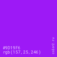 Цвет #9D19F6 в цветовой модели RGB обозначается тремя октетами (157, 25, 246) в десятичном формате и #9D19F6 в шестнадцатиричном (hex) формате, которые являются интенсивностью красного 157 (hex 9D), интенсивность зелёного 25 (hex 19) и интенсивность синего 246 (hex F6).