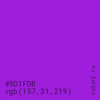 Цвет #9D1FDB в цветовой модели RGB обозначается тремя октетами (157, 31, 219) в десятичном формате и #9D1FDB в шестнадцатиричном (hex) формате, которые являются интенсивностью красного 157 (hex 9D), интенсивность зелёного 31 (hex 1F) и интенсивность синего 219 (hex DB).
