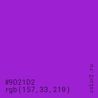 Цвет #9D21D2 в цветовой модели RGB обозначается тремя октетами (157, 33, 210) в десятичном формате и #9D21D2 в шестнадцатиричном (hex) формате, которые являются интенсивностью красного 157 (hex 9D), интенсивность зелёного 33 (hex 21) и интенсивность синего 210 (hex D2).