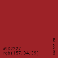 Цвет #9D2227 в цветовой модели RGB обозначается тремя октетами (157, 34, 39) в десятичном формате и #9D2227 в шестнадцатиричном (hex) формате, которые являются интенсивностью красного 157 (hex 9D), интенсивность зелёного 34 (hex 22) и интенсивность синего 39 (hex 27).