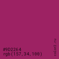 Цвет #9D2264 в цветовой модели RGB обозначается тремя октетами (157, 34, 100) в десятичном формате и #9D2264 в шестнадцатиричном (hex) формате, которые являются интенсивностью красного 157 (hex 9D), интенсивность зелёного 34 (hex 22) и интенсивность синего 100 (hex 64).