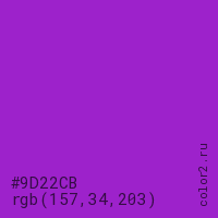Цвет #9D22CB в цветовой модели RGB обозначается тремя октетами (157, 34, 203) в десятичном формате и #9D22CB в шестнадцатиричном (hex) формате, которые являются интенсивностью красного 157 (hex 9D), интенсивность зелёного 34 (hex 22) и интенсивность синего 203 (hex CB).