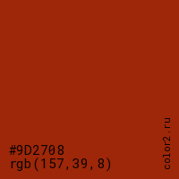 Цвет #9D2708 в цветовой модели RGB обозначается тремя октетами (157, 39, 8) в десятичном формате и #9D2708 в шестнадцатиричном (hex) формате, которые являются интенсивностью красного 157 (hex 9D), интенсивность зелёного 39 (hex 27) и интенсивность синего 8 (hex 08).
