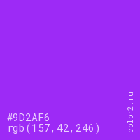 Цвет #9D2AF6 в цветовой модели RGB обозначается тремя октетами (157, 42, 246) в десятичном формате и #9D2AF6 в шестнадцатиричном (hex) формате, которые являются интенсивностью красного 157 (hex 9D), интенсивность зелёного 42 (hex 2A) и интенсивность синего 246 (hex F6).