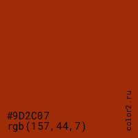 Цвет #9D2C07 в цветовой модели RGB обозначается тремя октетами (157, 44, 7) в десятичном формате и #9D2C07 в шестнадцатиричном (hex) формате, которые являются интенсивностью красного 157 (hex 9D), интенсивность зелёного 44 (hex 2C) и интенсивность синего 7 (hex 07).