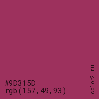 Цвет #9D315D в цветовой модели RGB обозначается тремя октетами (157, 49, 93) в десятичном формате и #9D315D в шестнадцатиричном (hex) формате, которые являются интенсивностью красного 157 (hex 9D), интенсивность зелёного 49 (hex 31) и интенсивность синего 93 (hex 5D).