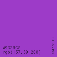 Цвет #9D3BC8 в цветовой модели RGB обозначается тремя октетами (157, 59, 200) в десятичном формате и #9D3BC8 в шестнадцатиричном (hex) формате, которые являются интенсивностью красного 157 (hex 9D), интенсивность зелёного 59 (hex 3B) и интенсивность синего 200 (hex C8).