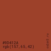 Цвет #9D412A в цветовой модели RGB обозначается тремя октетами (157, 65, 42) в десятичном формате и #9D412A в шестнадцатиричном (hex) формате, которые являются интенсивностью красного 157 (hex 9D), интенсивность зелёного 65 (hex 41) и интенсивность синего 42 (hex 2A).