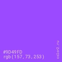 Цвет #9D49FD в цветовой модели RGB обозначается тремя октетами (157, 73, 253) в десятичном формате и #9D49FD в шестнадцатиричном (hex) формате, которые являются интенсивностью красного 157 (hex 9D), интенсивность зелёного 73 (hex 49) и интенсивность синего 253 (hex FD).