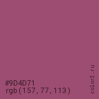 Цвет #9D4D71 в цветовой модели RGB обозначается тремя октетами (157, 77, 113) в десятичном формате и #9D4D71 в шестнадцатиричном (hex) формате, которые являются интенсивностью красного 157 (hex 9D), интенсивность зелёного 77 (hex 4D) и интенсивность синего 113 (hex 71).