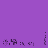 Цвет #9D4EC6 в цветовой модели RGB обозначается тремя октетами (157, 78, 198) в десятичном формате и #9D4EC6 в шестнадцатиричном (hex) формате, которые являются интенсивностью красного 157 (hex 9D), интенсивность зелёного 78 (hex 4E) и интенсивность синего 198 (hex C6).