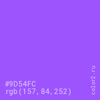 Цвет #9D54FC в цветовой модели RGB обозначается тремя октетами (157, 84, 252) в десятичном формате и #9D54FC в шестнадцатиричном (hex) формате, которые являются интенсивностью красного 157 (hex 9D), интенсивность зелёного 84 (hex 54) и интенсивность синего 252 (hex FC).
