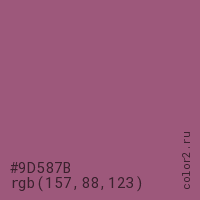 Цвет #9D587B в цветовой модели RGB обозначается тремя октетами (157, 88, 123) в десятичном формате и #9D587B в шестнадцатиричном (hex) формате, которые являются интенсивностью красного 157 (hex 9D), интенсивность зелёного 88 (hex 58) и интенсивность синего 123 (hex 7B).