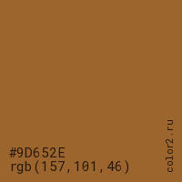 Цвет #9D652E в цветовой модели RGB обозначается тремя октетами (157, 101, 46) в десятичном формате и #9D652E в шестнадцатиричном (hex) формате, которые являются интенсивностью красного 157 (hex 9D), интенсивность зелёного 101 (hex 65) и интенсивность синего 46 (hex 2E).