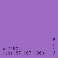 Цвет #9D6BC4 в цветовой модели RGB обозначается тремя октетами (157, 107, 196) в десятичном формате и #9D6BC4 в шестнадцатиричном (hex) формате, которые являются интенсивностью красного 157 (hex 9D), интенсивность зелёного 107 (hex 6B) и интенсивность синего 196 (hex C4).