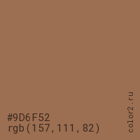 Цвет #9D6F52 в цветовой модели RGB обозначается тремя октетами (157, 111, 82) в десятичном формате и #9D6F52 в шестнадцатиричном (hex) формате, которые являются интенсивностью красного 157 (hex 9D), интенсивность зелёного 111 (hex 6F) и интенсивность синего 82 (hex 52).